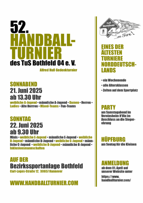 Seit mehr als 50 Jahren veranstalten wir für Euch eines der größten Handballturniere Norddeutschlands. Auf bis zu 16 Spielfeldern treten an einem Wochenende mehr als 1000 Spielerinnen und Spieler aller Altersklassen auf unserer Platzanlage in Hannover-Bothfeld gegeneinander an.